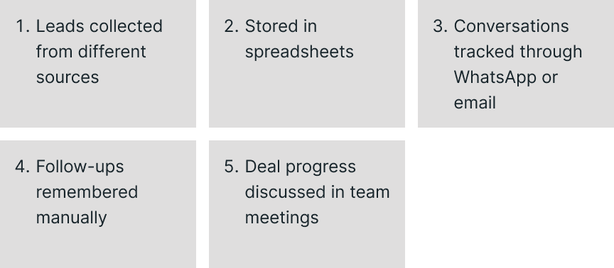 Many teams track leads across multiple platforms such as spreadsheets, WhatsApp messages, and email threads. This makes it difficult to maintain a clear overview of sales activities.