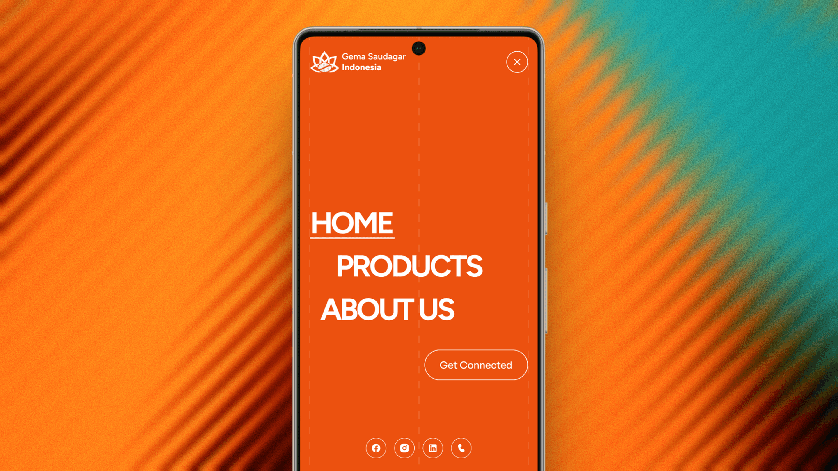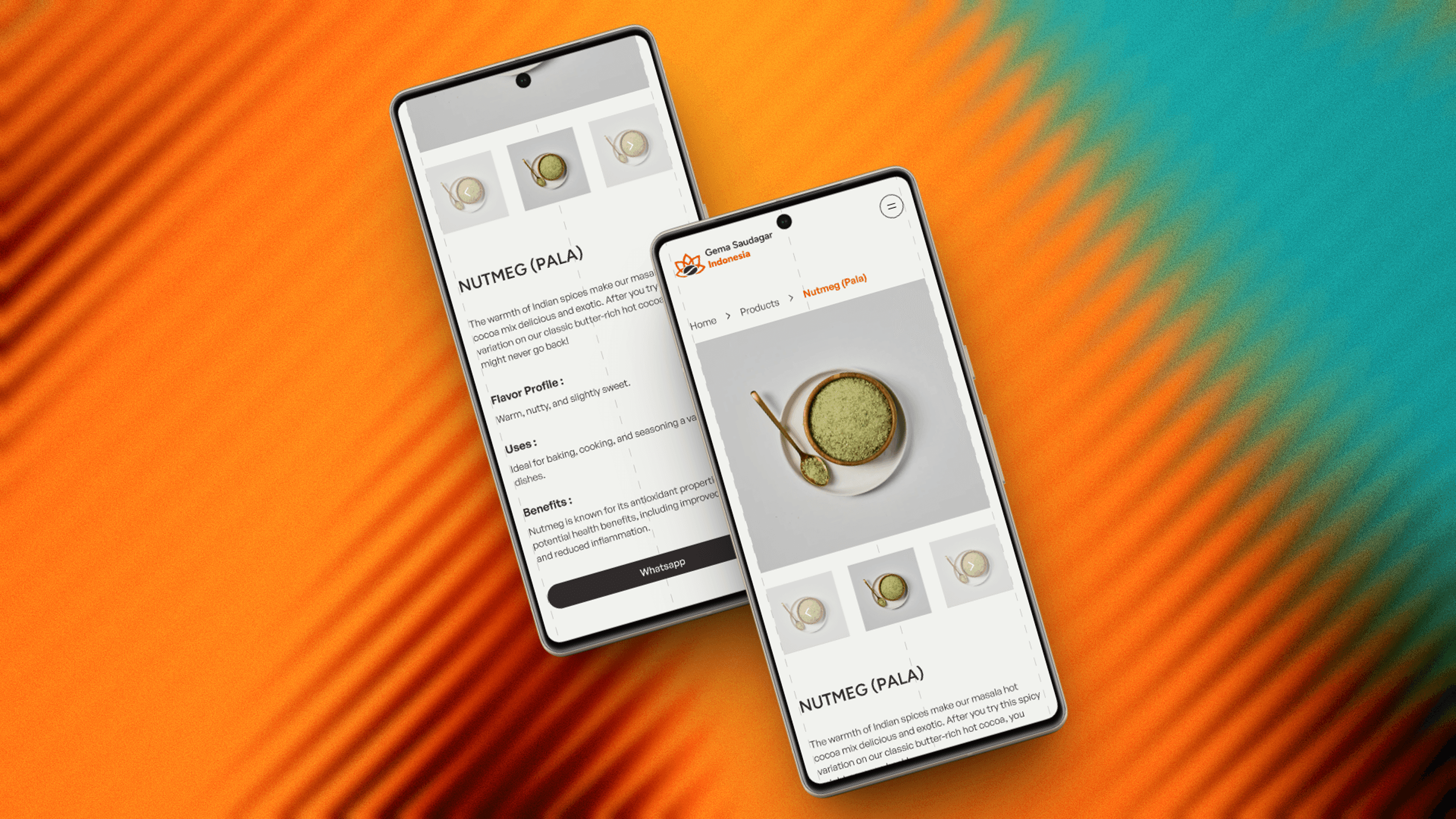 The full-bleed orange hamburger menu is a standout interaction the entire navigation expands into an immersive orange screen with oversized type, making navigation feel intentional and branded rather than utilitarian. Product pages stack cleanly with image galleries, flavor profiles, and a full-width WhatsApp CTA keeping B2B inquiries frictionless.