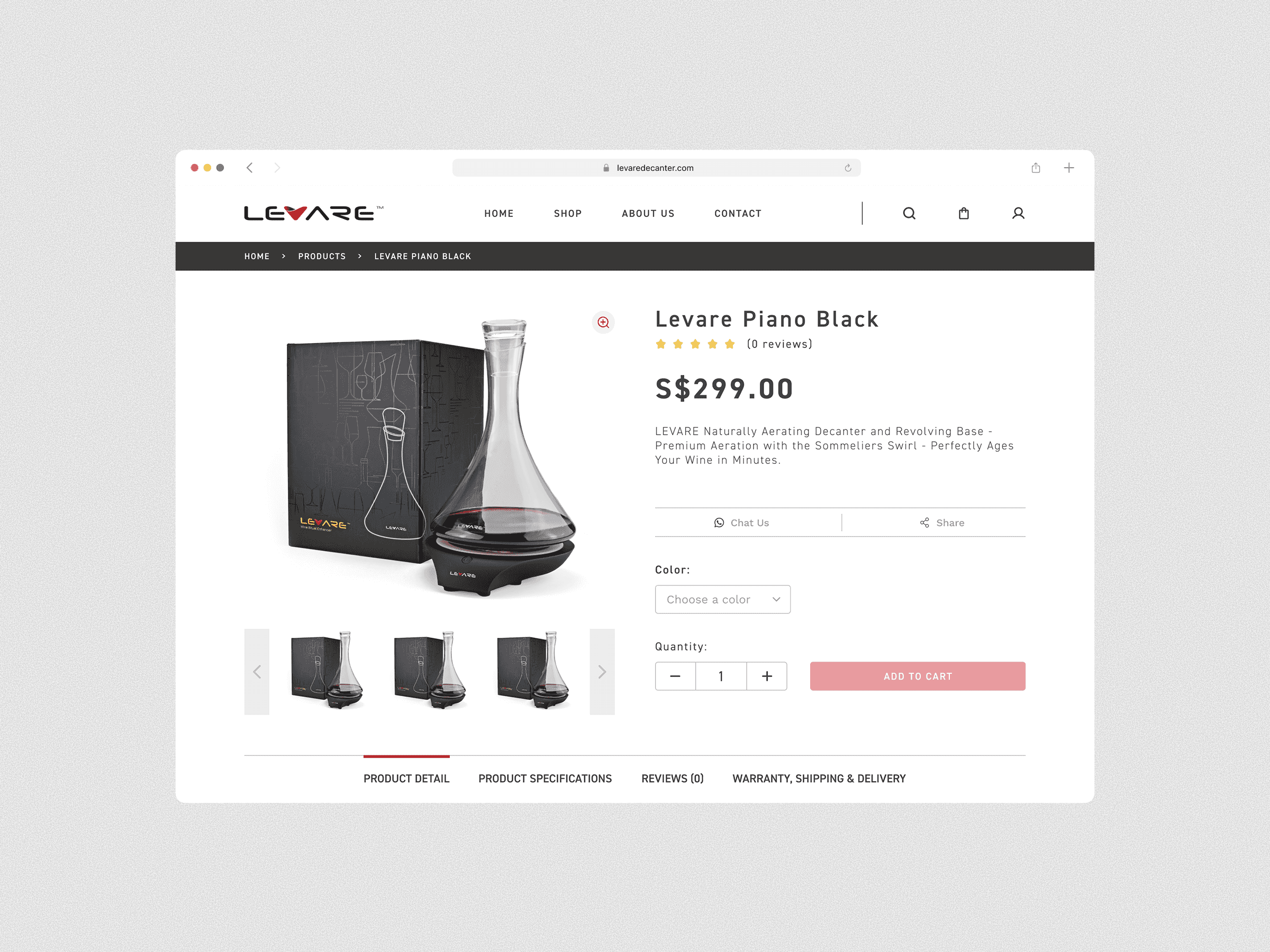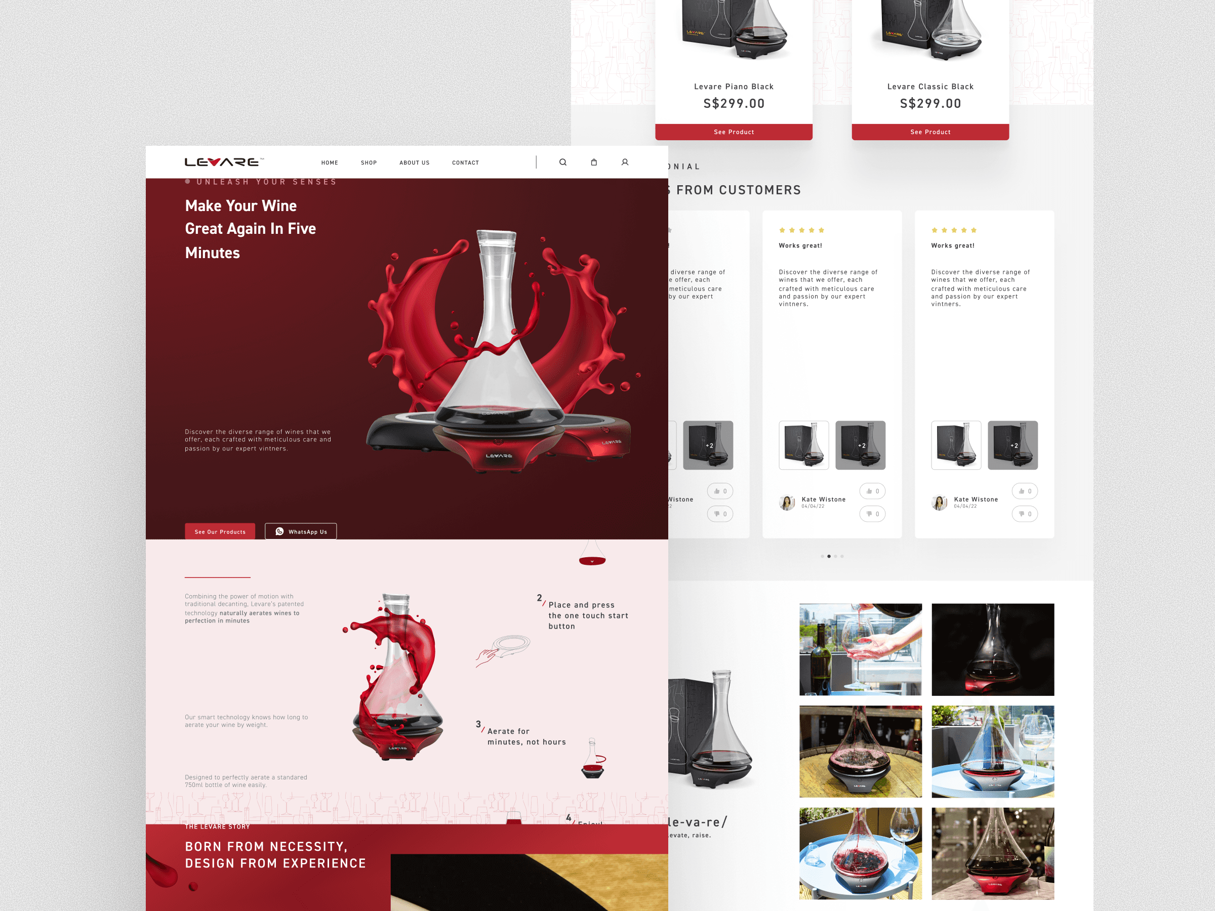 Levare is a revolutionary smart wine aerator designed to "Make Your Wine Great Again in Five Minutes." For this e-commerce landing page, the objective was to design a highly converting digital storefront that reflects the elegance, innovation, and premium quality of the device itself.