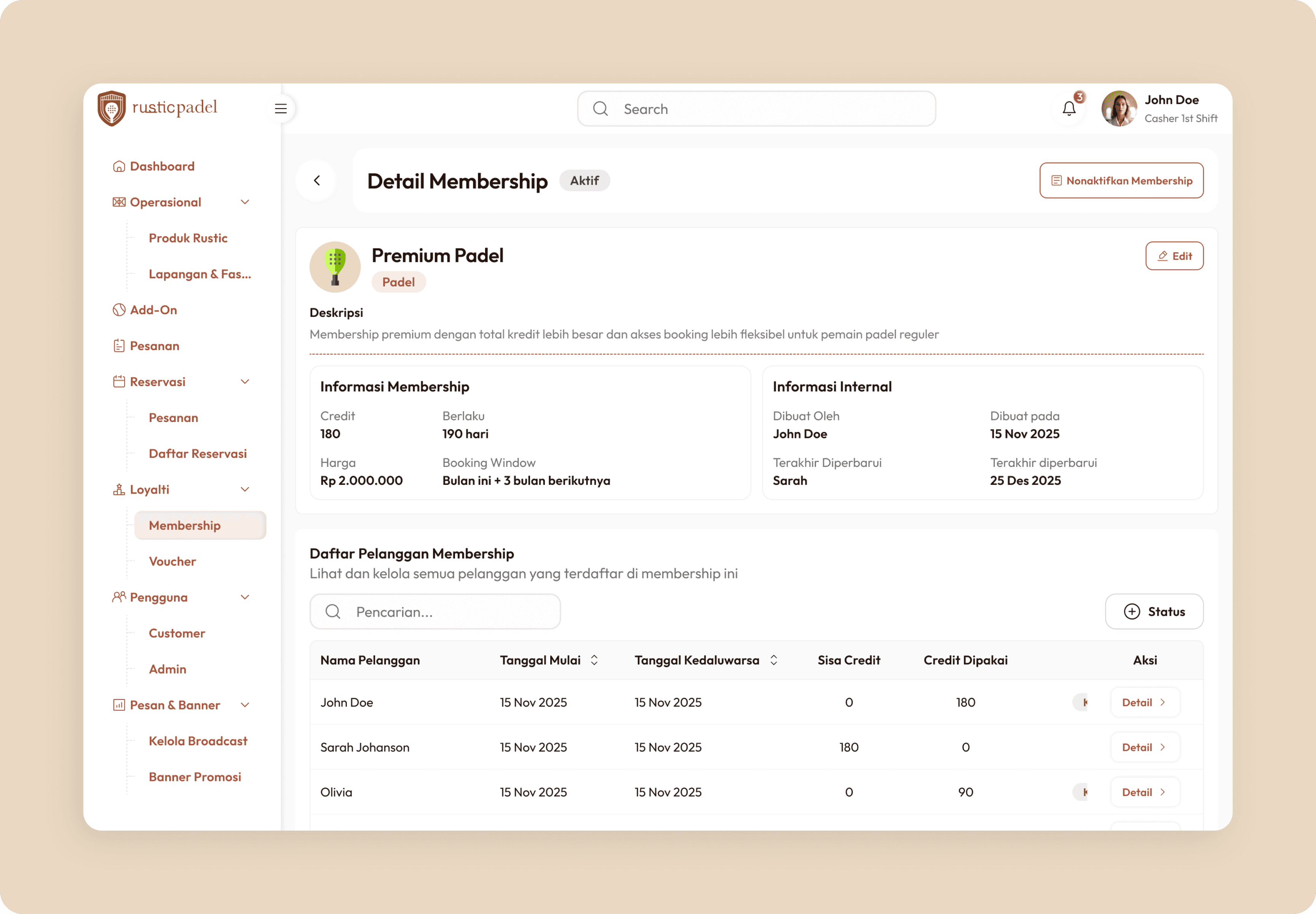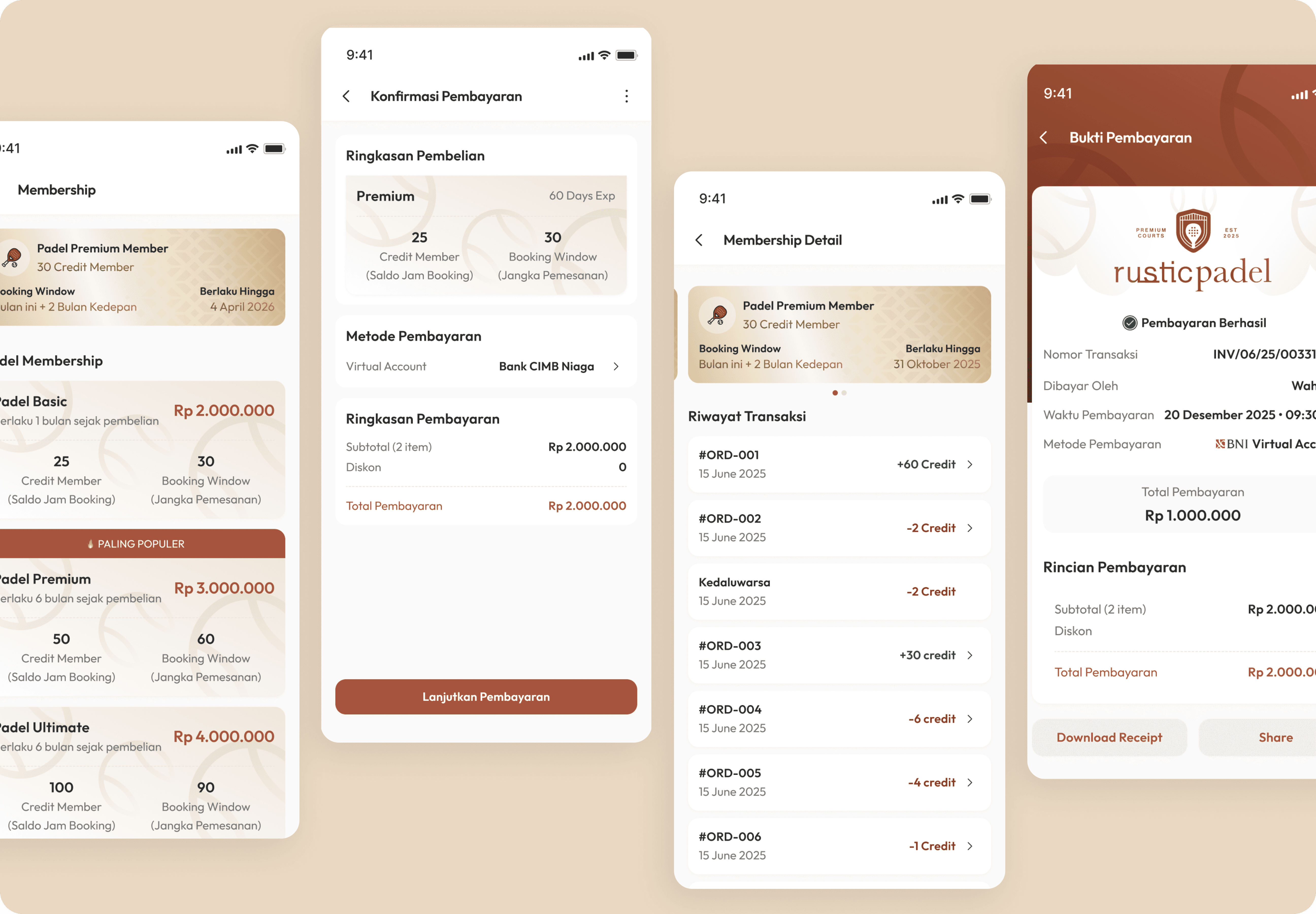 Rustic Padel offers membership packages with different pricing tiers and credit systems.